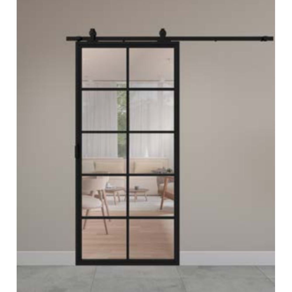 - Het frame van de schuifdeur is gemaakt van zwart gepoedercoat staal.